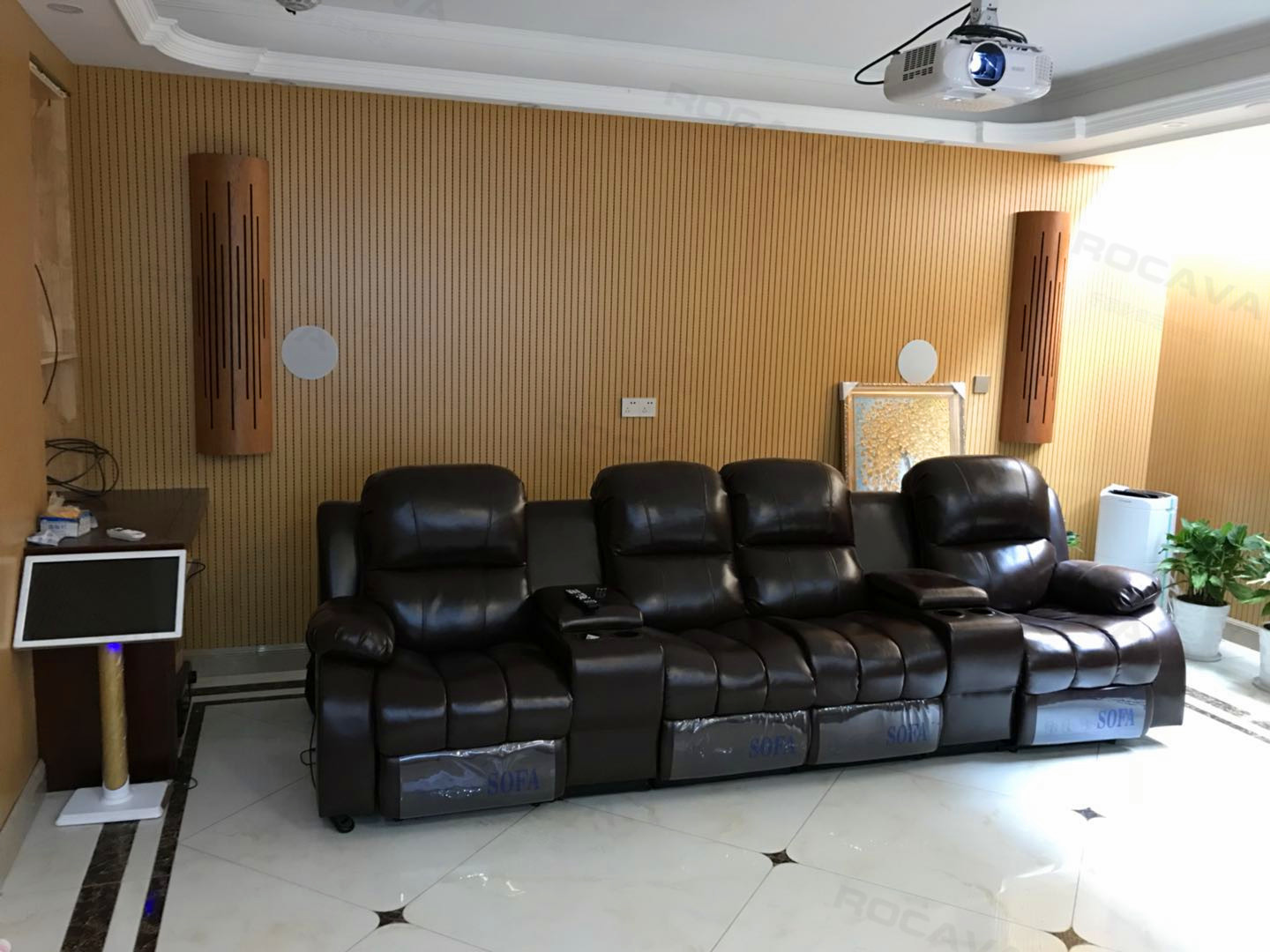 這個項目是一個別墅的地下室獨立空間,設計做娛樂影音室。首先,對整個空間的墻面做了吸音處理,提升聲場環境。因為該地下室空間比較潮濕,除濕這塊也是一并交由我們來做。主箱部分選用 丹麥達尼 Dali 品牌,該款落地箱好的效果能呈現一個高度協調、清晰、自然的聲場,每一個細節都能完美展現。搭配4個全隱藏式安裝 達尼 PHANTOM E-50 嵌入式音箱,營造良好的環繞聲聲場。低音炮選用 達尼 SUB E-12-F 低音炮,組成5.1.2環繞聲系統。
