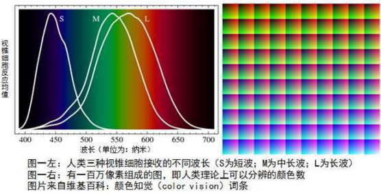 我們之所以會看到斑斕的色彩是由于照射到物體上的光線反射進入到眼球,在視網膜觸發三種視錐細胞反應而產生的。實際上,在照射到物體上的光波中,我們也只對一定波長的光線有反應(見圖一左)。但是僅僅如此小范圍的光波卻可以被人類感知,并分辨多達 100 萬種的顏色(見圖一右)。從進化的角度考慮,我們擁有如此發達的顏色感知系統應該表明顏色在我們的生存和生活中一定有著什么重要的作用。置身百萬色彩之中,我們會受到哪些影響呢?